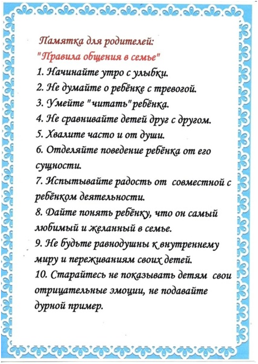 -У нас с вами сегодня получился очень насыщенный разговор. В конце нашего родительского собрания я хотела бы вам вручить памятки «Правила общения в семье».