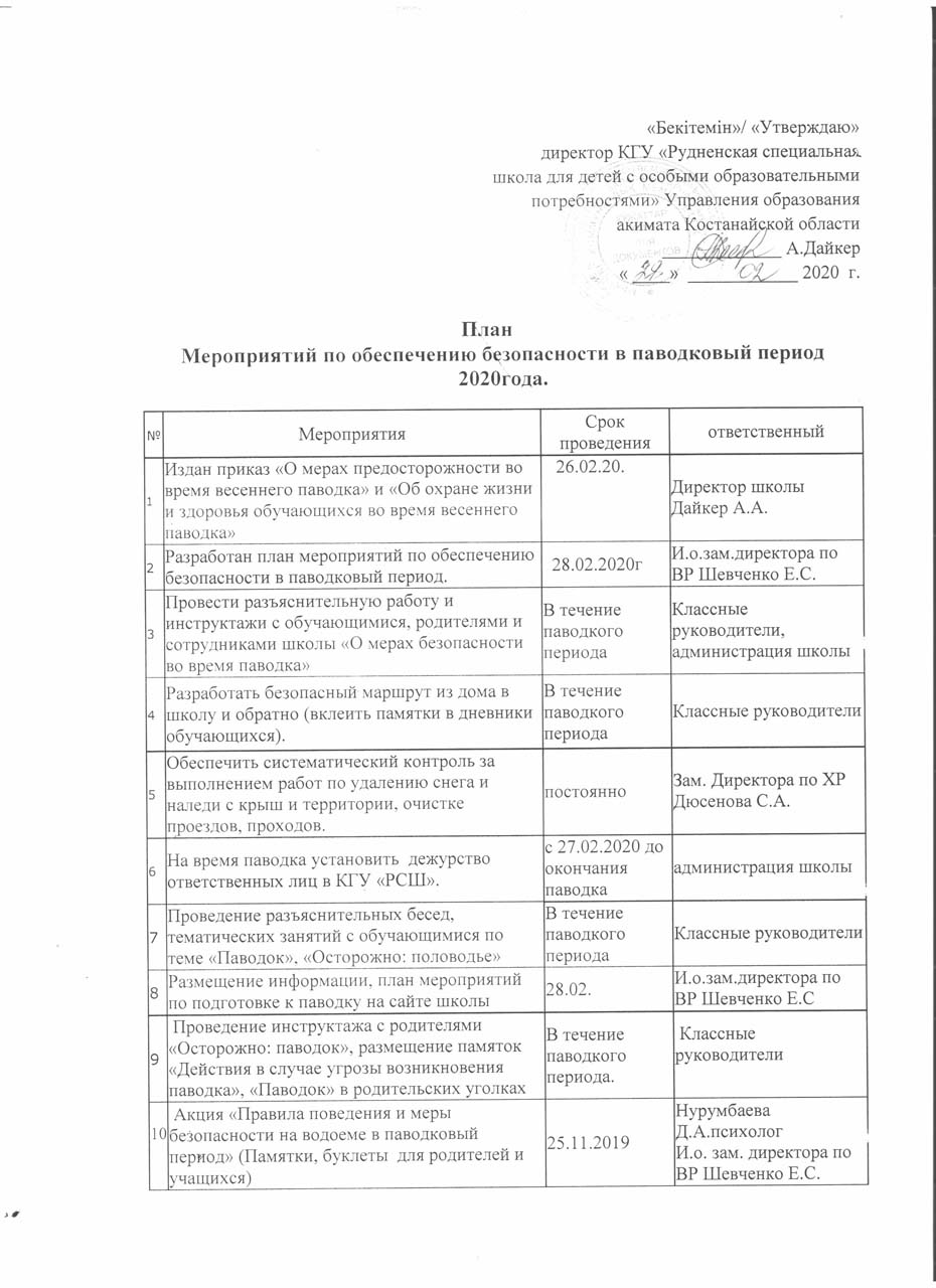 В целях обеспечения безопасности детей в период весеннего паводка, обеспечения сохранности жизни и здоровья обучающихся, сохранности зданий и сооружений в период возможного весеннего половодья, составлен план проводимых мероприятий в период паводка : «Об обеспечении безопасности в паводковый период».